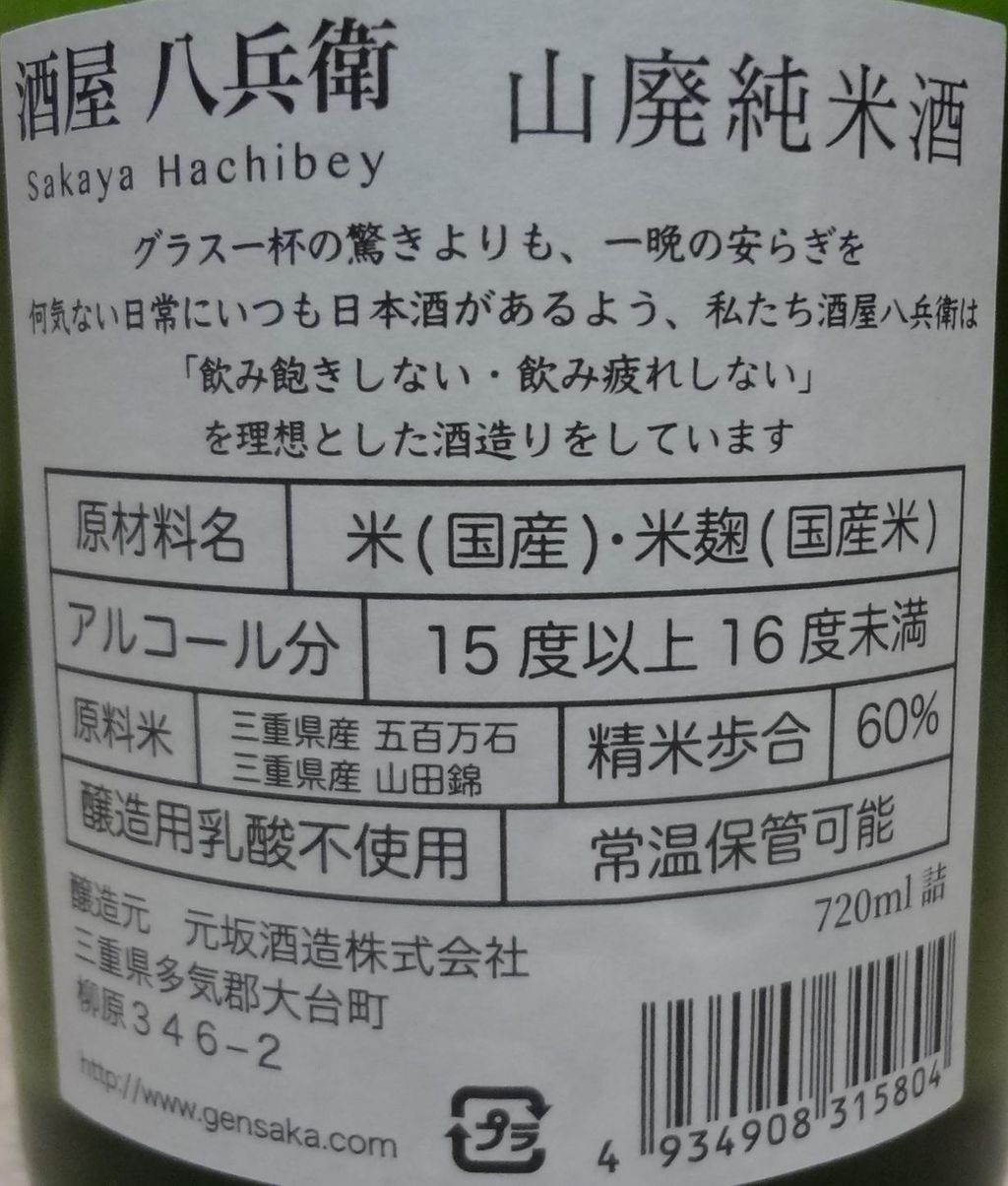 日本酒 酒屋八兵衛 山廃純米酒 元坂酒造 長野県内外の美味しい いっぽん 日本酒 記録帳